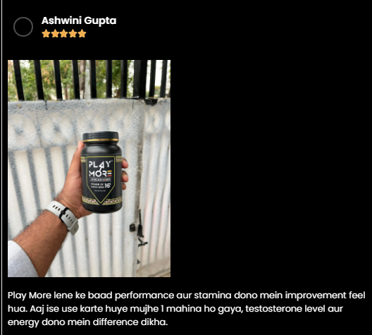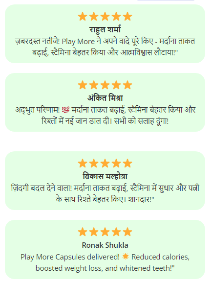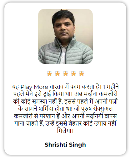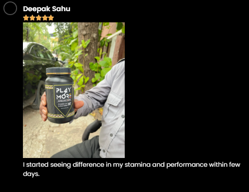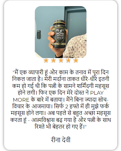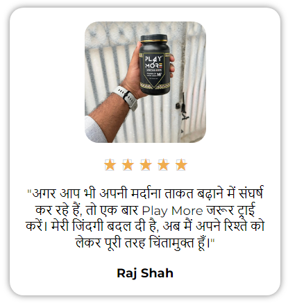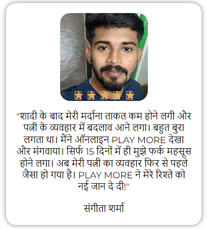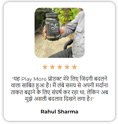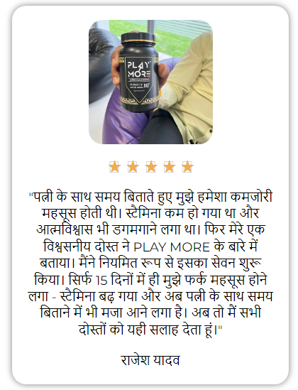 एक दिन इंटरनेट पर मैंने डॉ. राहुल वर्मा का वीडियो देखा, जिसमें उन्होंने PLAY MORE के बारे में बताया। उनकी बातों ने मुझे उम्मीद दी। मैंने तुरंत मंगवाया और इस्तेमाल करना शुरू किया – हर दिन सिर्फ 1 कैप्सूल।